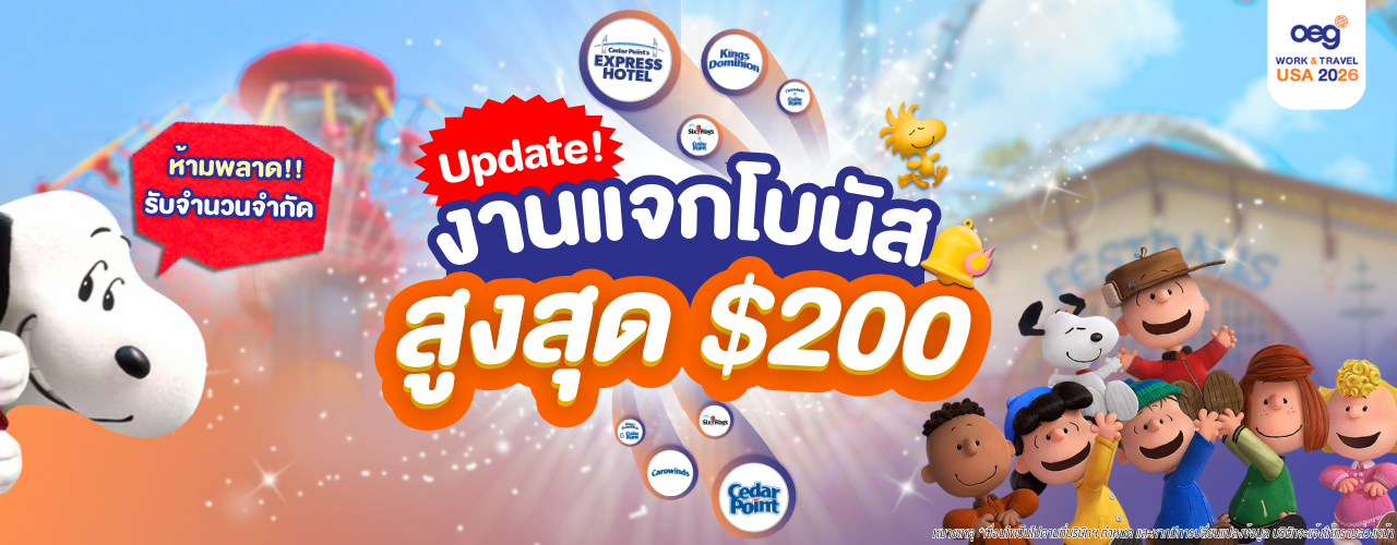 นักศึกษาที่เข้าร่วมโครงการ OEG Work and Travel USA 2026 ช่วง Spring กับสถานที่ทำงานในเครือ Six Flags Entertainment Corporation ตามที่กำหนด และสิ้นสุดโครงการโดยสมบูรณ์ จะได้รับเงินโบนัสเทียบเท่า จำนวน 200 ดอลลาร์สหรัฐ (USD) โดยมีรายละเอียดและเงื่อนไขดังต่อไปนี้